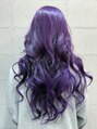 長くて艶黒髪から、吸い込まれるようなパープルにカラーチェンジし、さらに華やかさを感じてもらいたくてサラッと巻いてみました。カジュアルな装いの時には巻いて動きを出してあげると子供っぽくならずにおススメですよ。