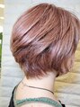 グラデーションボブ。襟足、サイドはタイトにし、トップにボリュームを出す。明るめピンク系イノアカラーとハイライト、イヤリングカラーの組み合わせ。前処理にメタルDX 、ケラスターゼカクテルトリートメントで後処理して艶感アップ。