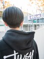 モードなセンターパートに、フロントのポイントカラーがお洒落!ブロンドとブラックのコントラストとストレートタッチでブラントなカットラインがよりかっこよさを強調してくれます。バックはガッツリ刈り上げでスッキリ!