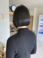 あごラインに合わせてぱつっと切りっぱなしボブ♪まとまりやすくなるよう、毛量も調整しています。グリーン系の色味とムラサキ系の色味を混ぜて赤みを少なく、艶感が出る仕上がりです^^