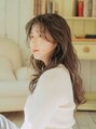 こっくりブラウンの緩めパーマ風の巻きを加えたヘアスタイルになっています。顔まわりには細かめカールを入れて、後ろはざっくりとカールを入れてラフな垢抜け感のあるスタイルになっています。バングは薄く作るのが◎