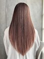 ツヤ感のあるピンク系カラーにさらっと落ちる様なナチュラルストレート。顔まわりのレイヤーが軽さも出す人気のスタイルです。