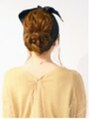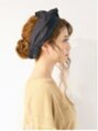ターバンを使ったアレンジ。あらかじめサイドの毛は残しておく。トップの毛はぼんのくぼあたりで留め、表面を引き出す。残したサイドの毛はひねった後引き出して調整。三つ編みを三本作り、さらにそれを三つ編みしてお団子を作ると完成。