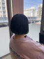 ワンレングスの前下がりボブです。内側にインナーグラを入れ内巻きになりやすくしています。濃いめの緑のバレイヤージュカラーにしています。