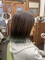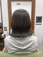 毛先の部分をブリーチで明るくしてから、グリーン系のカラーで染めました。全体の色は暗くなり過ぎない明るさで染めています。仕上げはストレートアイロンで外ハネにしています。