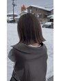 切りっぱなしボブスタイル。内巻きでも外ハネでもスタイリング可能です。カラーはブリーチをして暗めのグレージュカラーに。暗いカラーでも重く見えないのがポイントです。