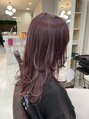 最初にブリーチで表面のみにハイライトを入れ、一度流してから今度は根元から中間部分までグレージュを毛先にはパープル系を入れたグラデーションカラーに仕上げました。