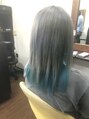 ケアブリーチをして表面シルバーグレー、インナーエメラルドブルーに染めました。