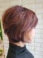 ダイヤモンドグラデーション。襟足はタイトにスッキリさせ、トップから後頭部にボリュームを出し、サイドは小顔効果のある長さに設定。イノアカラーとハイライト、イヤリングカラーの組み合わせ。メタルDX とケラスターゼカクテルトリートメント使用。