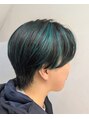 センターパートに青緑のハイライトを入れてます。全体は暗めのアッシュで染めてます。