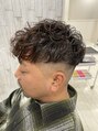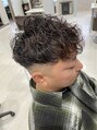 前髪に長さと重さを残してカール感をしっかり出したスペインカール。刈り上げの幅や長さを人によって調整し、ワイルドにもインテリジェンスにもオシャレな感じにも出来るメンズパーマデザインです。