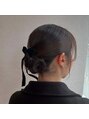 お呼ばれヘアセット艶のあるタイトなシニヨンベロアのリボンはお持ち込みいただきました♪