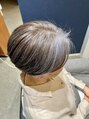 内側は刈り上げの前髪なしショートボブスタイル。カラーは白髪を活かしたハイトーン。白髪を染めるというより馴染ませるカラー。お客様のカラーの履歴により施術が難しくなる(工程が増える、色味が変わる)等の可能性があります。一度ご相談下さい。