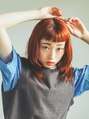 眉上のミニバングと顔まわりにいれたレイヤーがおしゃれ見えするポイント!発色が鮮やかなオレンジは、ベースが暗い方はダブルカラーをおすすめします!ヘアとリップはリンクさせて全体を統一感のある仕上げにするとより素敵に。