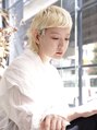 ホワイトブリーチのハイトーンカラーで周囲と差をつけた個性的なマッシュウルフショート。オン眉ショートバングやぱっつん前髪、前髪パーマで目力強調。トップにボリュームをつけてスタイルUP効果。くせ毛風カールでフレンチカジュアルなヘアアレンジもOK。