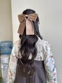 スーパーロングヘアをハーフアップにして、毛先は大きいカールをつけてふんわりさせました。前から見た時に少しリボンの端が見える高さでつけたので、正面から写真をとってもリボンをつけてると分かるアレンジです。