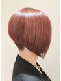 刈り上げ前下がりグラデーションボブ。襟足は刈り上げタイトに、後頭部は丸みをもたせ、鋭角の前下がりボブスタイル。レッドのイノアカラーでビビッドな赤さを強調。後処理にケラスターゼカクテルトリートメント施術。