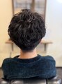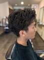 男らしさとラフな魅力を兼ね備えたスタイル。前髪を上げたアップバングで爽やかさを演出し、無造作なパーマが自然な動きをプラス。セットも簡単で、カジュアルからビジネスまで幅広く対応可能。