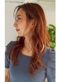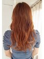 全体にレイヤーをたっぷりいれたロングスタイル。前髪は少し下ろして頬骨くらいでカット。カラーは暖色系のレッドブラウン系でやわらかい印象に!もともと明るめのベースの方なのでカラーも発色しやすくブリーチなしでもでからカラーです。
