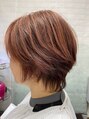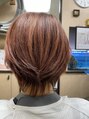くびれショートボブトップからバックにかけてのボリューム感をネープのくびれを造ることによって大人女性を上品にひょうげんいます。カラーはバレイヤージュによりスタイルをより立体感を出す事で豊かな動きを強調しています。