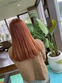 オレンジヘア。アイロンとヘアオイル仕上げ。ブリーチ履歴から、根本のリタッチ部分はブリーチなしでつなげたオレンジカラーです。