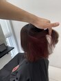 範囲広めのインナーカラーレングスが短いので範囲を広めにブリーチをしてあげることでインナーが透けて見えて可愛いです!また、ハーフアップなどヘアアレンジしても明るく部分が多いので可愛く見えます!ブリーチは一回で赤っぽいピンクに仕上げました!