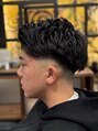 しっかりかぶった感じ+スキンフェードも強調したい!との事だったのでバックはフェードが見える所でバランスを見てかぶりのラインを決めました♪スタイリングはエヌドットのジェルグリースで束感とツヤを出しています♪