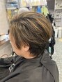 ハイライト+カラーカットしながらトリートメントでご来店。サイドのみツーブロックでエリア長めでウルフ気味な前下がりレイヤーボブ。ハイライトを細目に多めに、若干の白髪はぼかしてあります!退色するとハイライトがベージュになる様グレージュに♪