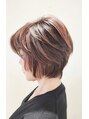 ダイヤモンドグラデーションボブ。襟足はタイトにスッキリさせ、トップにボリュームを出し、サイドは小顔効果のある長さに設定。後頭部は丸みをもたせる。イノアカラーとハイライト、イヤリングカラーの組み合わせ。メタルDX 、ケラスターゼカクテルTr施術。