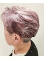 ツーブロックショート。サイド内側から襟足にかけ刈り上げ、トップにボリュームを出す。ピンク系イノアカラーで白髪ぼかしスライシングカラー。ファイバープレックスで前処理、後処理にケラスターゼカクテルトリートメント使用。