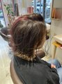 アンブレラカラーで表面をレッド系にしてメリハリをつけたスタイル分け目を変えれば見え方も変わり、アシメのスタイルにもありますモデルさんはくせ毛で、クセも動きのあるスタイルに
