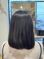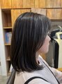広がりやすい髪質なのであまり軽くはせず、束で量を取るようにして量感を調整してあります。毛先は少しラインを残すようにしてあります。カラーは明るすぎず暗すぎずのアッシュカラーで透け感を。