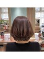上品な大人ボブスタイル。グラデーションに段差をつけて、丸くボリューミーで動きのあるボブスタイル。前髪を長くして流すように巻いて、エレガントに仕上げ。