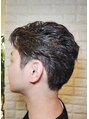 メンズツーブロック。サイド内側から襟足にかけ刈り上げ、トップはやや長めに軽くし、くせ毛をパーマのように活かすショートスタイル。