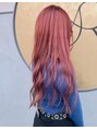 顔まわりのみに少しレイヤーの入ったロングスタイルに一度ブリーチを施してから、バイオレットピンクを重ねた鮮やかなカラーです!
