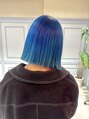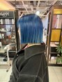 鮮やかなブルーヘアを切りっぱなしボブと合わせて。鮮やかさが欲しい場合はブリーチ1回~2回必要です。