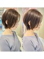 【気に入って頂いたスタイルは、ブックマークをしてご提示ください】baseをレザーカットでシルエットを作り、質感調整で柔らかさを出しました。丸いひし形シルエットはショートの王道です。