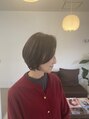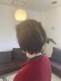 ボリュームがなくペタンとしてしまう毛質。骨格に合わせて形を作り、全体的に束感がでるようにすいていきます。ココア色の明るめの白髪染め。