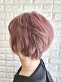グラデーションショート。襟足はタイトにスッキリさせ、後頭部は丸くボリュームを出す。サイドは小顔効果のある長さに設定。明るいピンク系イノアカラーとハイライト、イヤリングカラーの組み合わせ。メタルDX 、ケラスターゼカクテルトリートメント施術。