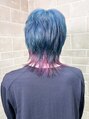 全体がマリンブルー、襟足がパープルのインナーカラーウルフ。個性的でおしゃれ。