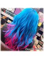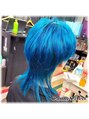 アニメとかに出てきそうな二次元風個性派ヘアーパステル系の青緑カラーにカットは襟足の真ん中だけ長めに残した変則的カット今回は三つ編み仕上げで