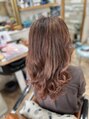 バレイヤージュハイライト、ヴァリジョアカラー、強髪プログラム、シャンプーブロー。裾に向かって明るくグラデーションしていくバレイヤージュハイライトを15枚ほど。ベースはレッドピンク。根本の白髪もカバーしながら、明るい髪色も楽しめる。