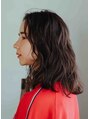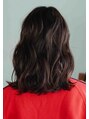 大きいゆるめのウェーブがかかったミディアムヘア。ウェーブの柔らかさと自然なダークブラウンのカラーが落ち着いた大人っぽさのある雰囲気です。透明感のあるカラーは顔周りをより明るい表情で見せることかできます。
