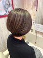 ベーシックなナチュラルショートボブに白髪ぼかしハイライト。イルミナカラーのナイトスカイをオン。グレージュカラーで柔らかい質感に。