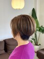 サイドを刈り上げた、アシンメトリーバランスのショートボブ。カットバランスを見ながら、シャドールーツでカラーしました。全体ににブリーチをしてありますが、髪質改善もしてクセを伸ばしてあります。