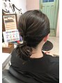 肩に当たるかな、ぐらいのミディアムスタイルを纏めています。時間がかからず・やり過ぎない、大人のひとつ結びアレンジヘア。ブリーチでハイライトが入っているので、さっとまとめてカッコ良し!!風の強い日や、首元にデザインのあるお洋服等にお勧め。