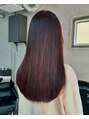 ブリーチ履歴無し。赤と紫のカラー剤+カラートリートメントを配合し、発色濃いめの深めの色味に。メテオトリートメント配合。カラーと髪質改善(酸熱トリートメント)を同時施術し、艶々なストレート仕上がりに。