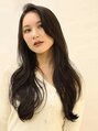 ナチュラルな印象の黒髪ロングヘアを、クールでスタイリッシュな印象のかきあげ前髪でアレンジ。全体はゆるめのウェーブで軽やかな印象に仕上げています。