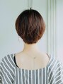 スッキリと首が見えるタイトなショートスタイルでバングは目の下くらいにカットして巻いておろしたりかきあげたりアレンジの出来る長さになっています。バングが今流行のうざバングなので襟足は少し重めの質感でバランスをとっています。