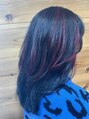 ハイライトは太めにレッドを、黒い部分は黒染めをしました。当店の黒染めは弱いブリーチで落とすことができます!セット方法、スタイリング剤までご提案させていただきます!【碧南/カラー/ハイライト/デザインカラー/レッド】